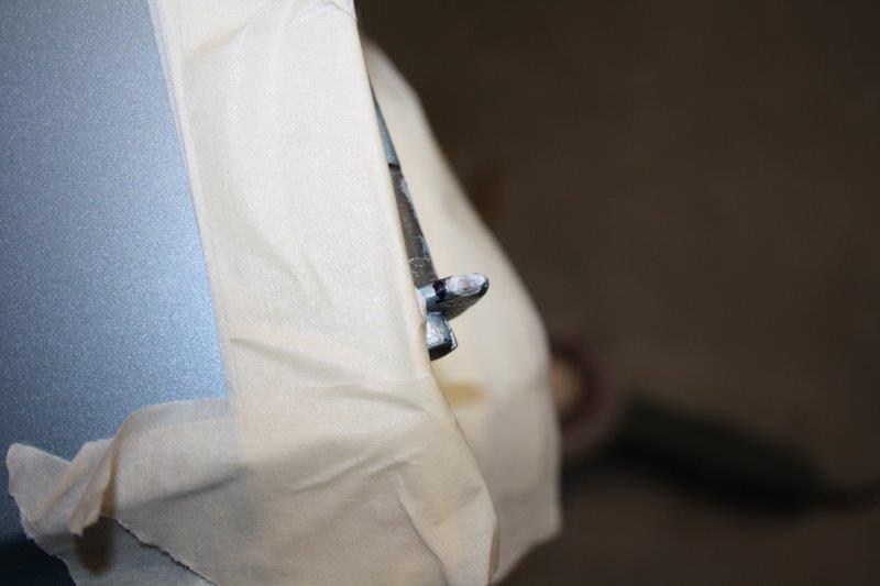 Und mit einem Heiden-Respekt und hochkonzentriert spann ich die 24er-Fiberscheibe auf den Winkelschleifern und futschle mit gaaanz viel Gefühl und nochmehr Geduld das Gelenk runter ???. Glaubt mir, das ist echt gar kein gutes Gefühl, an den frisch lackierten Teilen mit dem kreischenden Winkelschleifer zu hantieren! Feile, Säge und Co hab ich zwar in Erwägung gezogen, wegen der hin- und herwacklerei der Tür auf den Böcken wieder verworfen. Ruck-zuck wäre die Tür von den Böcken gefallen, dann ist die Kacke auch am dampfen. Dann lieber den Winkelschleifer und minimal-invasiv, der hierbei entstehende Schaden könnte vielleicht ein Spot-repair-Mensch wieder richten.