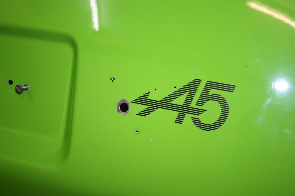 Das A5-Logo ist voll im Weg und muss leider weg - echt schade aber auch, Mann :-\! Und ich tu mich da echt schwer, das Logo runter zu machen... einerseits, weil ich das A5 einfach stilistisch echt unglaublich gut finde, und andererseits, weil auch da echt schon richtig viel Arbeit reingeflossen ist... mangels Verfügbarkeit habe ich die Logos und Dekore Anfang der 2000er anhand eines alten Aufklebers rekonstruiert und mit AutoCad gezeichnet. Die Plotterei war sauteuer, aber das hatte ich glaube ich schon erwähnt, oder? Ach ja, und überhaupt finde ich das 1981er-Design mit den schmalen Streifen und dem A5, das über die Streifen hochsteht einfach nur das passendste Design für den alten 5er :). Aber hilft ja alles nix, ist im Weg und muss runter.
